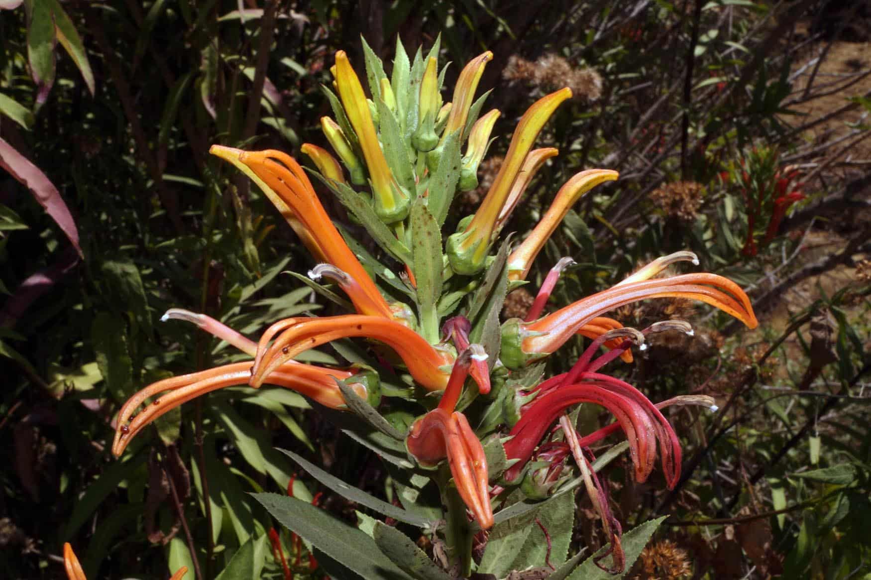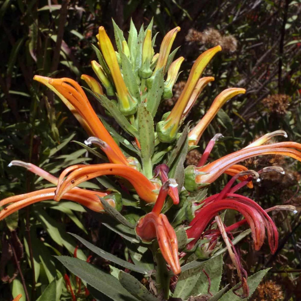 “Tabaco del diablo” Originaria de Chile .Una de las perennes mas bonitas que se pueden cultivar en nuestros jardines. Cada año llega a crecer hasta 2 mts. y forma champas de 1 mt. De diámetro. A mediados de verano aparecen las espigas de flores en tonos de rojo, anaranjado o rosado. Se cultiva a pleno sol y suelos drenados. En invierno se poda y vuelve a aparecer la primavera siguiente, bonito follaje verde o gris de hojas grandes. Resistente a la sequia y al frio de nuestra zona central.