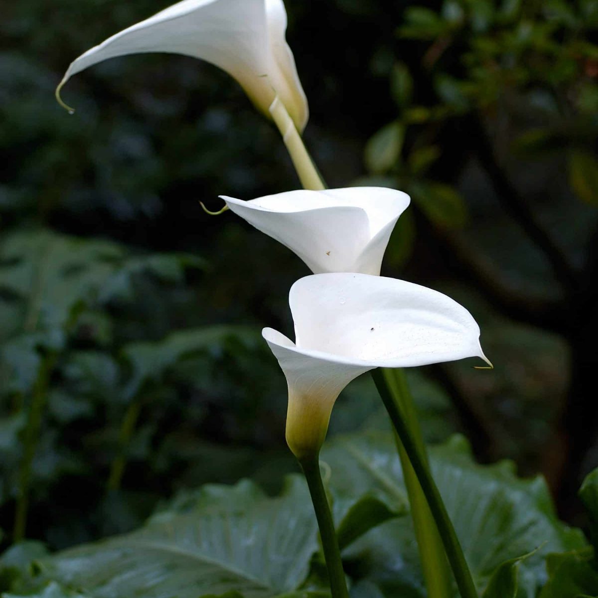 Cala. Planta originaria de Sudáfrica que vive gracias a un tallo carnoso subterránea que rebrota cada año. Sus flores aparecen desde primavera a otoño, con un suave perfume. Prospera mejor en lugares húmedos en la semisombra o sombra. El vivero tiene las variedades” Kiwi Blush” color crema con centro rosado y “Green Goddess” blanca con punta de la espata teñida de verde. Algunas variedades introducidas por el vivero.